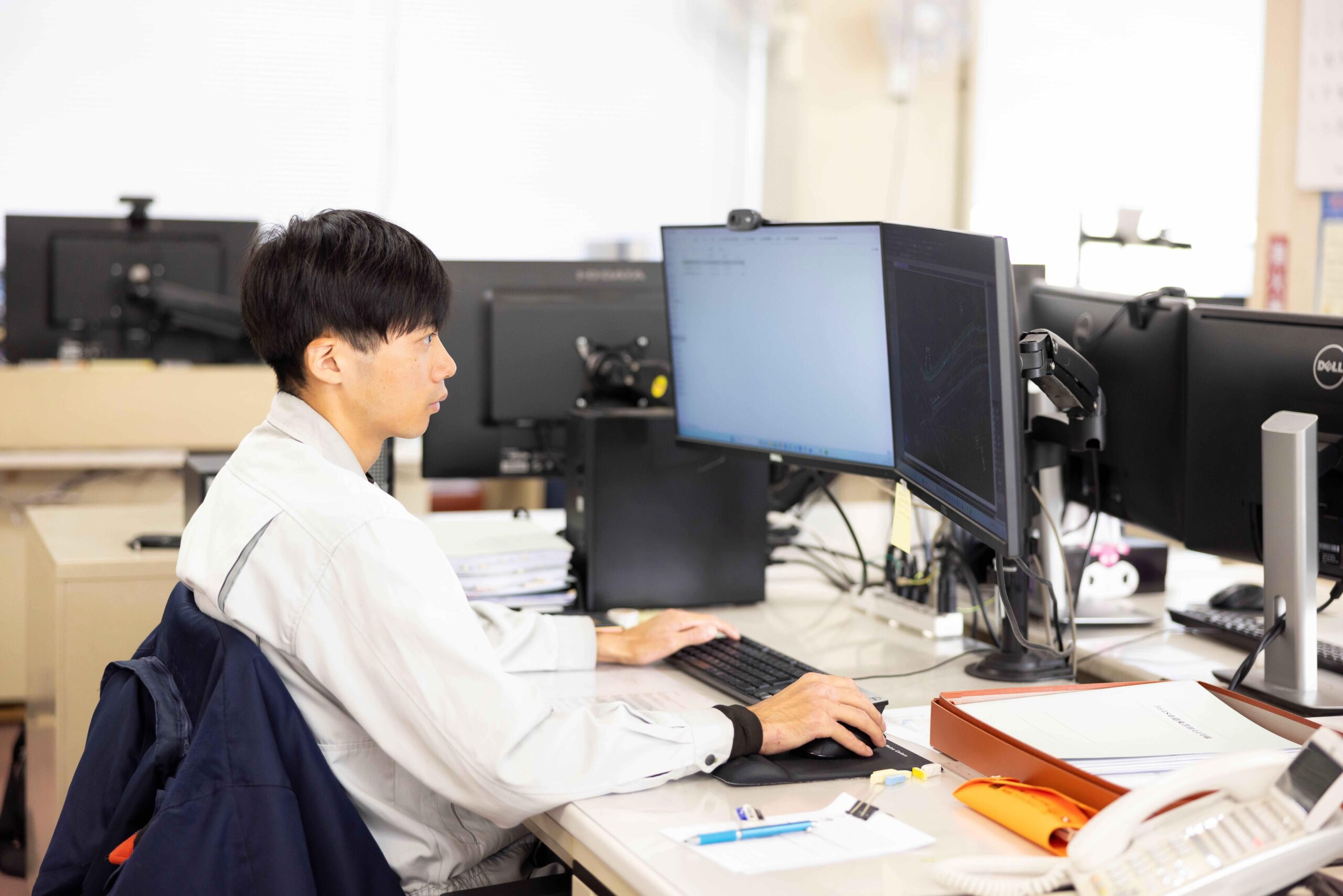 現場での測量やデータ計算を基に、道路・河川や災害復旧などの設計を行い、地域の安全を技術で守る大きなやりがいを実感できる仕事です。