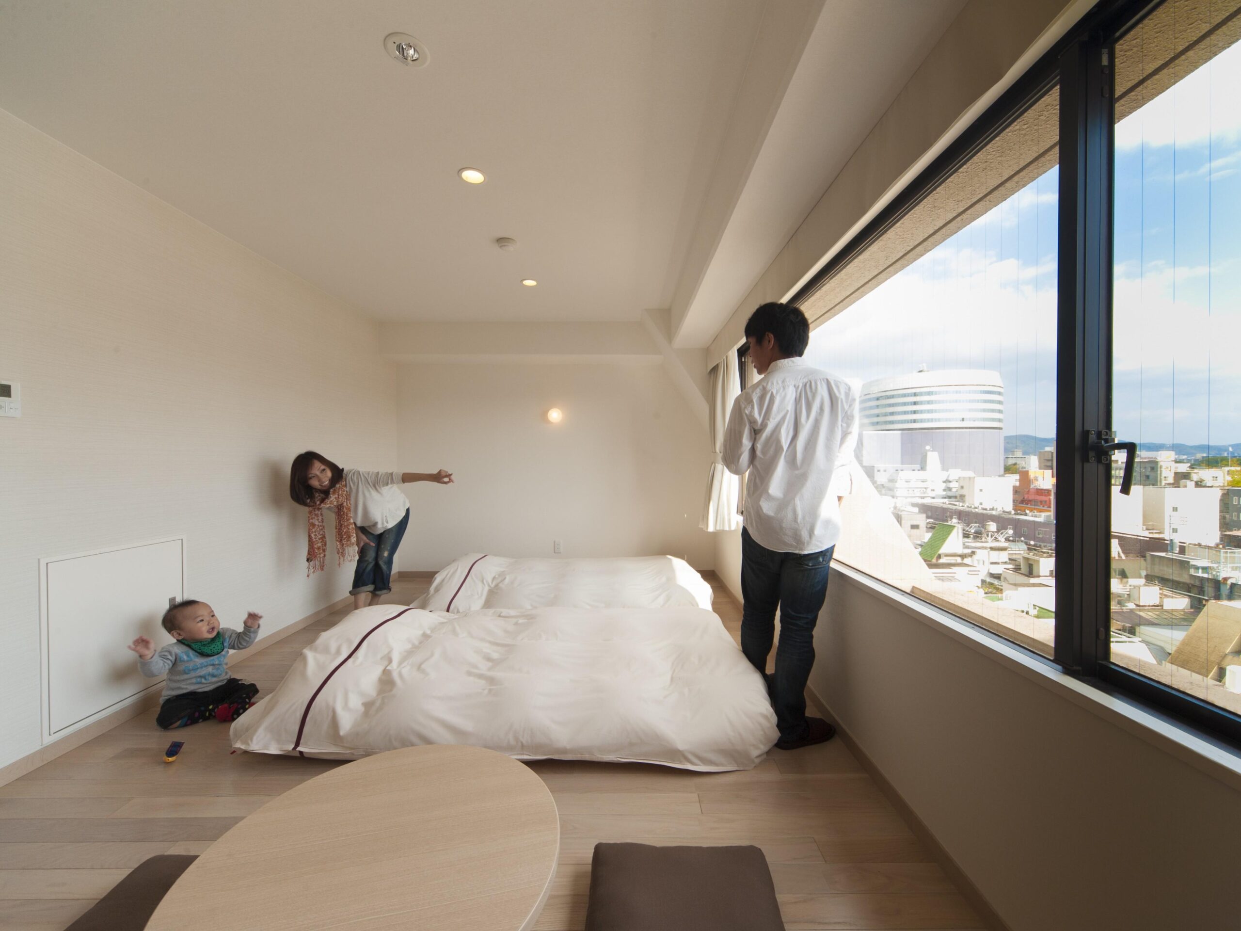 ○子連れで出張や観光で旅行するパパママに快適にお過ごしいただけるように、一部の客室をお布団でお休みいただくように改装しています。これによってベッドのように添い寝していて落ちる心配なく、お部屋も自由にハイハイしたり歩き回ることができる環境をご提供できます。