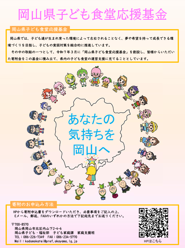 岡山県では、子ども達が生まれ育った環境によって左右されることなく、夢や希望を持って成長できる環境づくりを目指し、 子どもの貧困対策を総合的に推進しています。 その中の取組の一つとして、令和7年3月に「岡山県子ども食堂応援基金」を創設、この基金を活用して、県内企業や個人の方からいただいた寄附金を基金に積み立て、県内の子ども食堂の運営支援に充てることとしています。