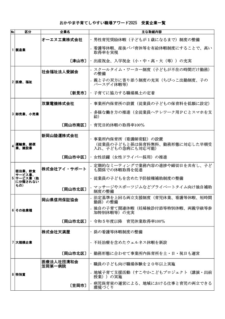 - 【受賞者決定!!】おかやま子育てしやすい職場アワード2025